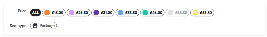 The row underneath similarly shows ‘Seat type’, where you can select different types of ticket, for example ‘Packages’. Selecting this option will filter to seats which have a package included in the ticket price.