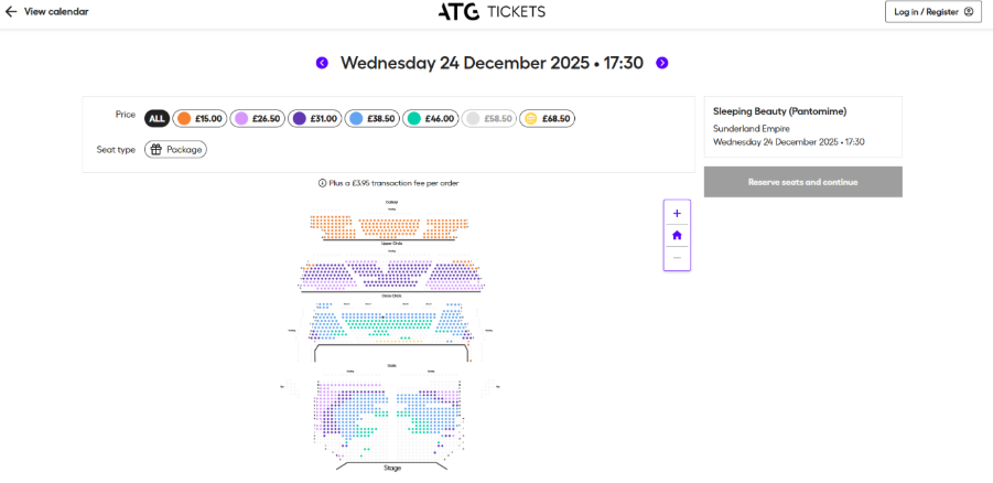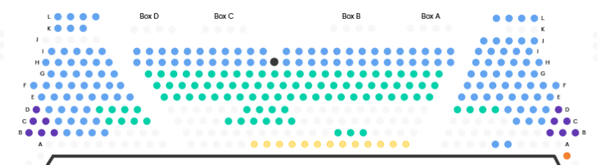 The seating map is colour coded by price, and to purchase a seat you click on the circle of the seat you want to select. Some seats will have special icons on them, for example packages. Seats that are greyed out are not available for purchase and you cannot click on them, this might be because the seat has already been sold or that the seat is not available for purchase at this time.