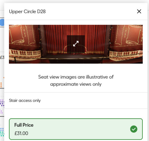 When you select a seat on the seating plan, a window opens which tells you the seat location within the venue, any required additional information e.g. stair access only, and the opportunity to click the image to see the approximate view from the seat.